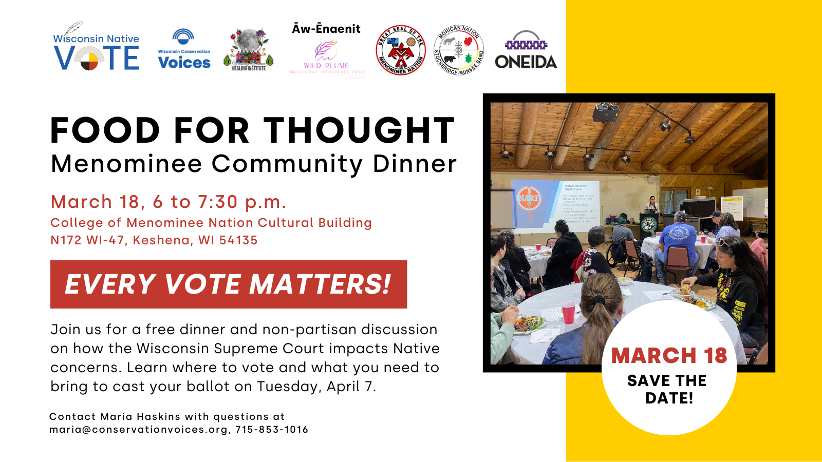 Join us for a free dinner and non-partisan discussion at the College of Menominee Nation on how the Wisconsin Supreme Court impacts Native concerns. Learn where to vote and what you need to bring to cast your ballot on Tuesday, April 7.