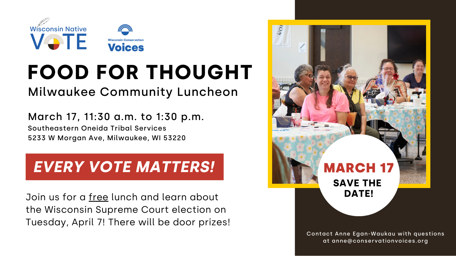 We’ll have a non-partisan discussion on how the Wisconsin Supreme Court impacts Native concerns. Learn where to vote and what you need to bring to cast your ballot on Tuesday, April 7. We will have door prizes!